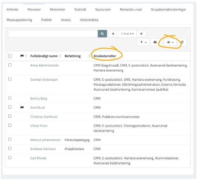 Alla användare i CRM har inte samma tillgång. Vissa kan hantera event, andra fundraising, andra allt. När du har en användarlista kan du enkelt synliggöra detta: